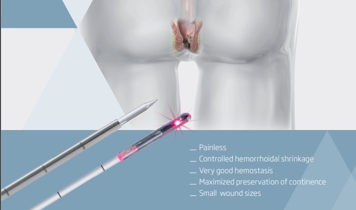 - Hemorroidoplastia por fotocoagulación con láser LHP: Esta técnica produce una retracción inmediata de los vasos arteriales causantes de las hemorroides. La fibra láser se aplica sobre las hemorroides mediante punción directa. Una serie de pulsos láser regulados en su frecuencia e intensidad producen la contracción de las hemorroides por coagulación directa de los vasos sanguíneos que las producen. Con ello se consigue obliterar la masa hemorroidal y el tejido redundante, preservando la mucosa y el esfínter anal, además de proporcionar la reconstrucción fibrótica y generar nuevo tejido conectivo, lo que previene la recurrencia del prolapso. Especialmente indicado en hemorroides grado III y IV.