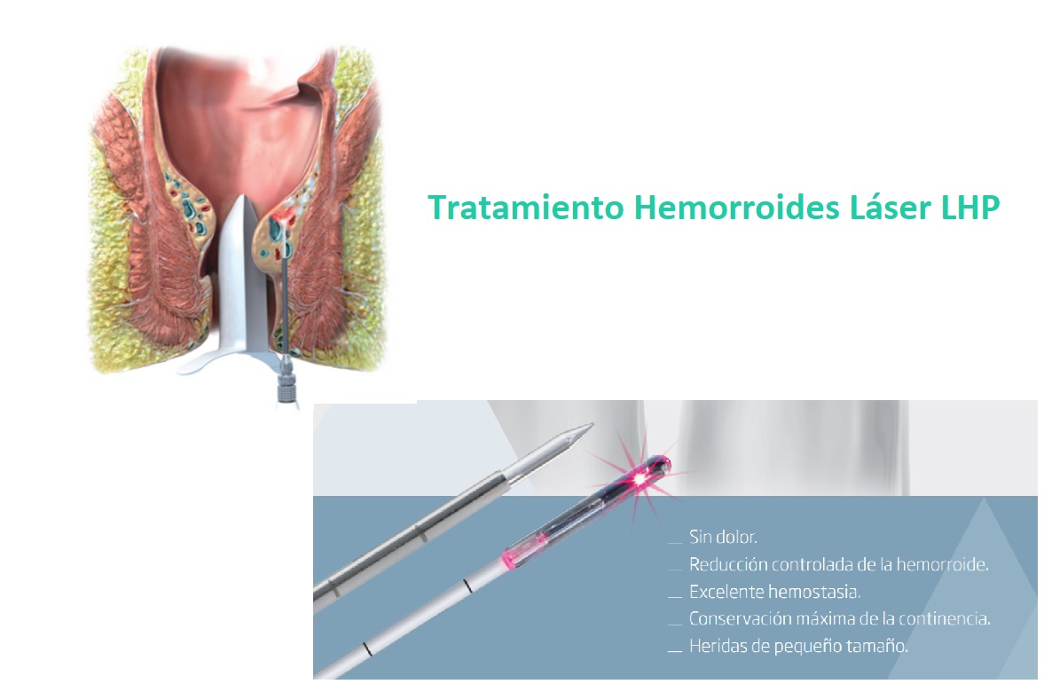 - Hemorroidoplastia por fotocoagulación con láser LHP: Esta técnica produce una retracción inmediata de los vasos arteriales causantes de las hemorroides. La fibra láser se aplica sobre las hemorroides mediante punción directa. Una serie de pulsos láser regulados en su frecuencia e intensidad producen la contracción de las hemorroides por coagulación directa de los vasos sanguíneos que las producen. Con ello se consigue obliterar la masa hemorroidal y el tejido redundante, preservando la mucosa y el esfínter anal, además de proporcionar la reconstrucción fibrótica y generar nuevo tejido conectivo, lo que previene la recurrencia del prolapso. Especialmente indicado en hemorroides grado III y IV.
